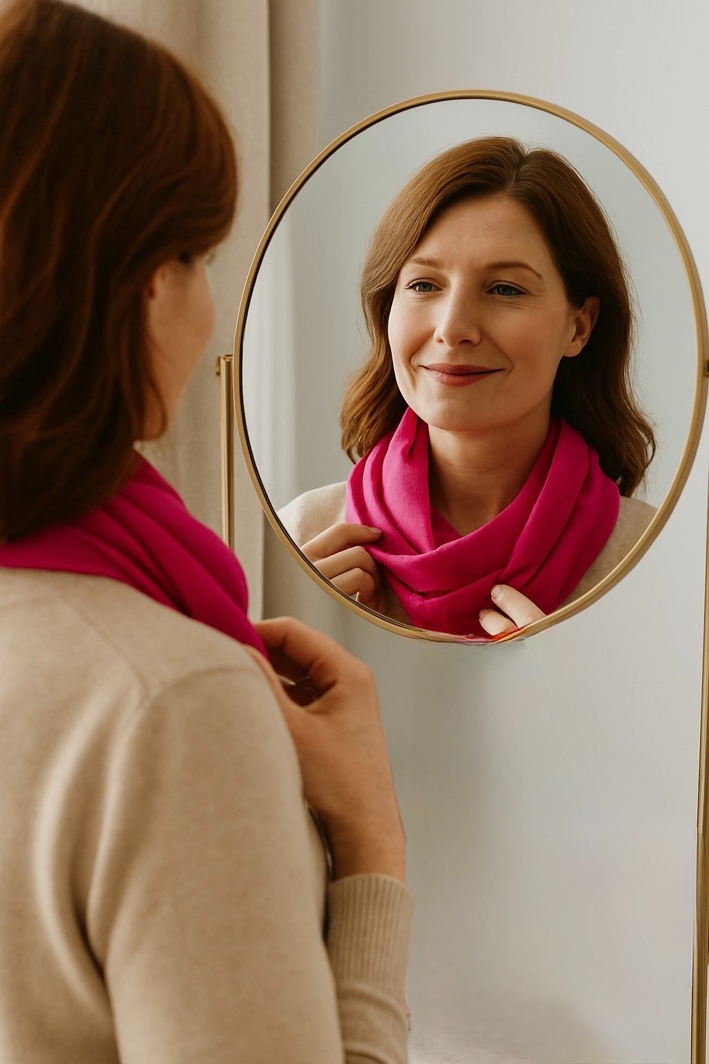 Observez votre silhouette dans le miroir et ajustez un accessoire ou un détail.